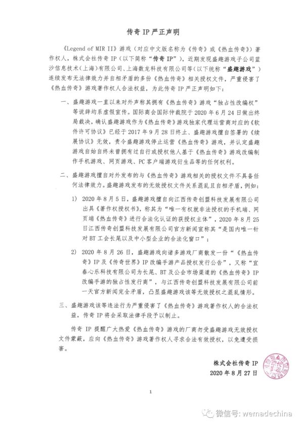 近日,娱美德有限公司(以下简称“娱美德”)官方微信公众号发布《传奇IP严正声明》(以下简称“传奇IP声明”)表示,盛趣游戏一直以来对外声称其拥有《热血传奇》(又称传奇,英文名LegendofMir2)游戏“独占性改编权”等说辞均系虚假宣传;盛趣游戏擅自对外发布的与《热血传奇》游戏相关的授权文件不具备任何法律效力。