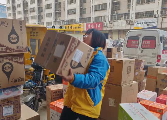 11月13日中午,记者来到了位于管城区列里路西周路附近的快递一条街,挨家挨户探访了多个物流站点,在一堆没过肩膀的快递纸箱里,发现了一位留着齐耳短发的女快递员。听闻记者来意后,她朴实地憨笑几声,告诉记者自己的时间并不富裕。说会儿话的功夫,她便骑着载满快递的电动车扬长而去,撂下一句“我十五分钟后就回来。”